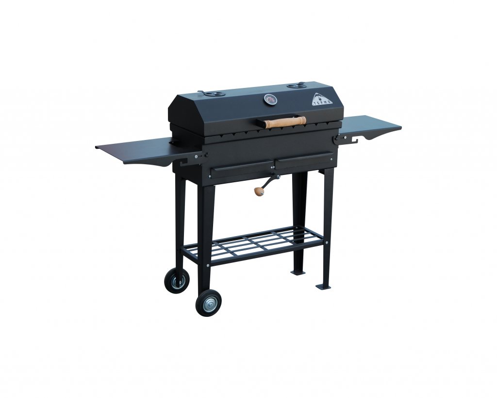 Гриль-барбекю «Термо» оборудован специальным термометром для контроля температуры в процессе работы. Контроль температурного режима можно осуществлять, как с помощью вентиляционных заслонок, так и регулированием степени открытия зольных ящиков, а также с помощью механизма регулировки высоты дна гриля. Три удобные полки позволяют с комфортом разместить все необходимые аксессуары.