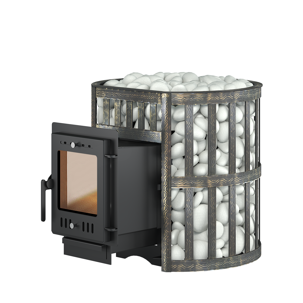 Для устройства наружной открытой каменки печь ЭТНА 24 (210) М оснащается сеткой из стальной ленты. Узор на наружной поверхности сетки патинирован термостойкой бронзовой краской. Пространство между печью и сеткой заполняется камнями для бани, которые выполняют роль теплонакопителя, перераспределяют тепло от стенок топки и защищают парящихся от жёсткого инфракрасного излучения. Воду подают на нагретые камни, с которых полученный пар распространяется по всему объёму парной.