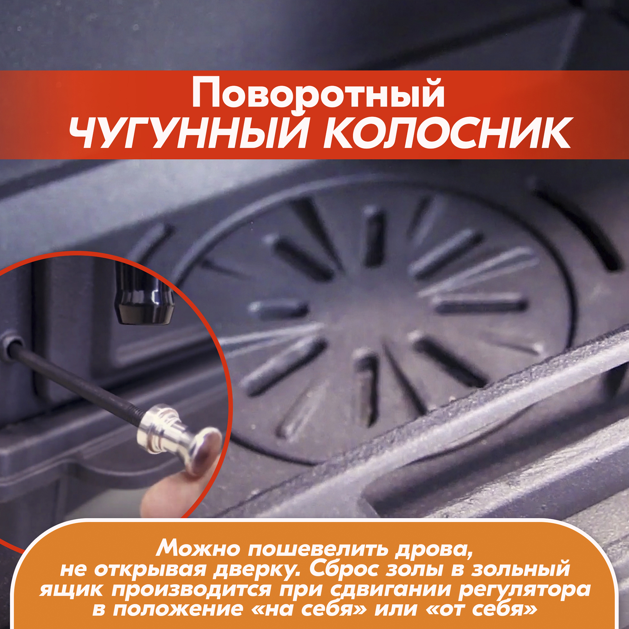 Чугунная конструкция печи-камина гарантирует прочность, долговечность и износостойкость на долгие годы использования.