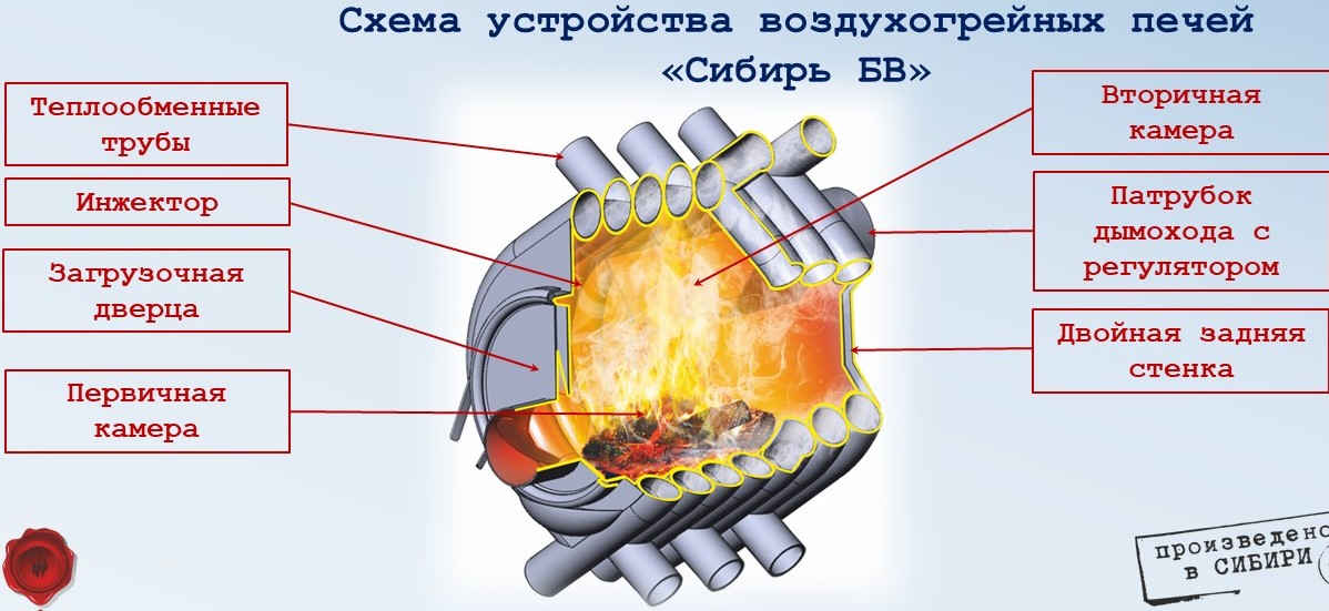 За счет использования сплошного ряда теплообменных труб в боковых стенках увеличена поверхность теплоотдачи и решена проблема интенсивного инфракрасного излучения при номинальной мощности эксплуатации печи. Холодный воздух, из отапливаемого помещения, за счет конвекции поступает в нижние отверстия теплообменных труб, а через верхние возвращается в помещение нагретым до температуры от 60 до 80 градусов.Таким образом, воздух равномерно нагревается и перемешивается по всему объему помещения. Печь имеет двухкамерную топку, в которой методом тлеющего горения в две стадии происходит сжигание топлива и дожиг печных газов. Печные газы, образовавшиеся от тления дров в нижней (первичной) камере поступают в верхнюю (вторичную) камеру, где дожигаются за счет подачи в нее, через специальные инжекторы подогретого воздуха из отапливаемого помещения.