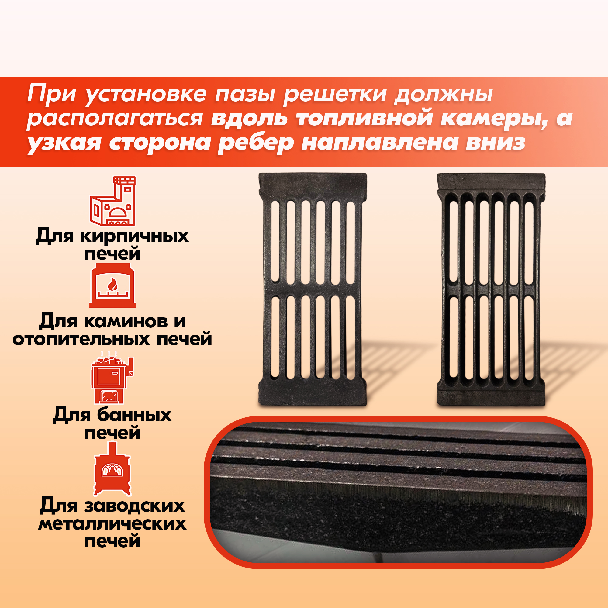 Колосник нужно устанавливать узкой стороной рёбер вниз, в противном случае срок его службы значительно снижается.