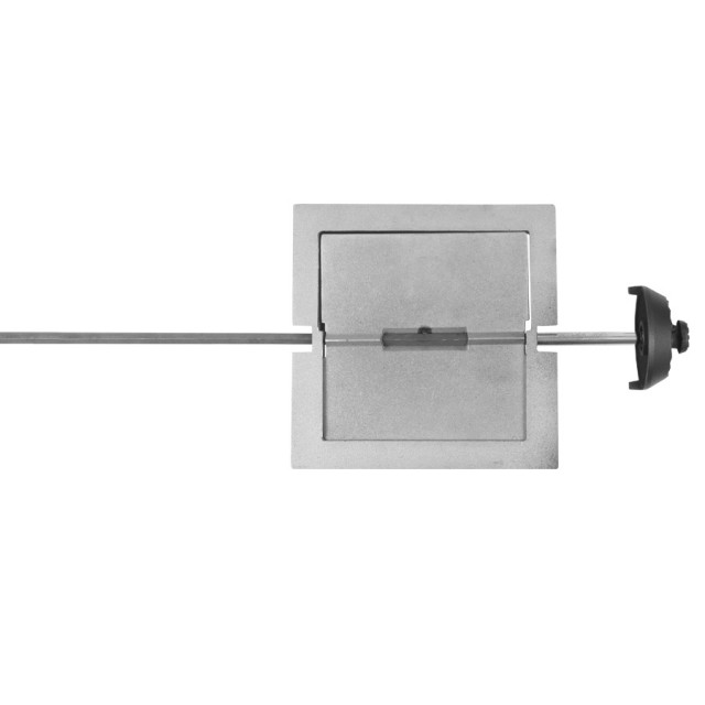Задвижка позволяет регулировать тягу в дымоходе, обеспечивая выход дымовых газов в атмосферу. После прогорания дров в топочной камере и прекращения горения задвижка закрывается, тем самым предотвращая выход теплого воздуха в трубу. Задвижка с поворотным блинком. Блинок крепится в рамку на длинную ось. Открывается и закрывается задвижка с помощью ручки на длинной оси. Блинок может фиксироваться в трёх положениях: "Закрыто", "Открыто на 30°", "Открыто на 60°", "Открыто на 90°". Длина стержня меняется в зависимости от расположения дымохода в конструкции печи, камина или уличного барбекю. Возможность увеличения или уменьшения длины оси позволяет печнику использовать данные типы задвижек в любом дымоходе, независимо от расстояния между дымоходом и топливником.